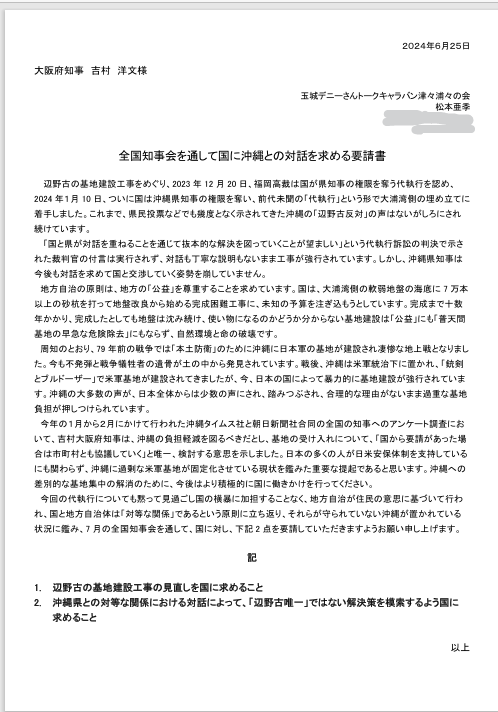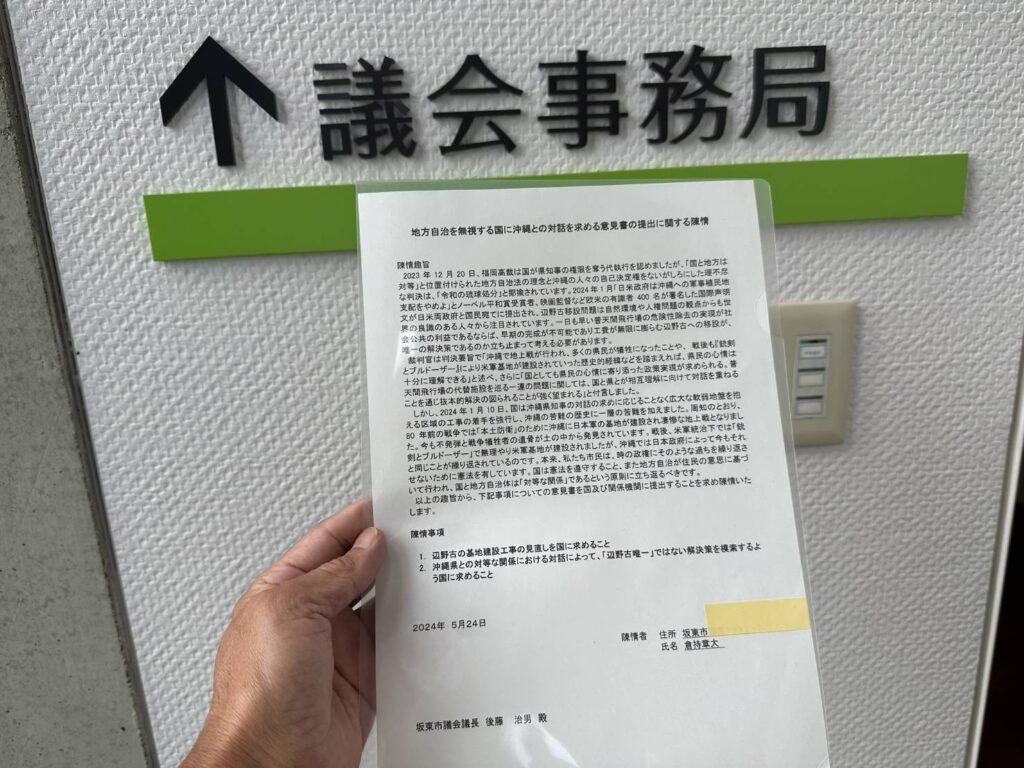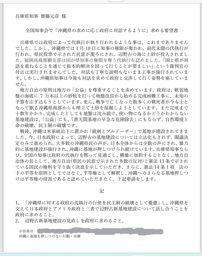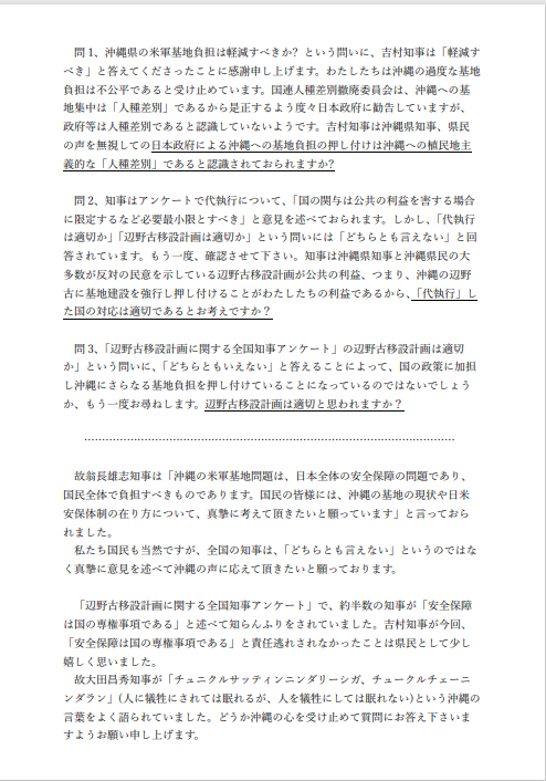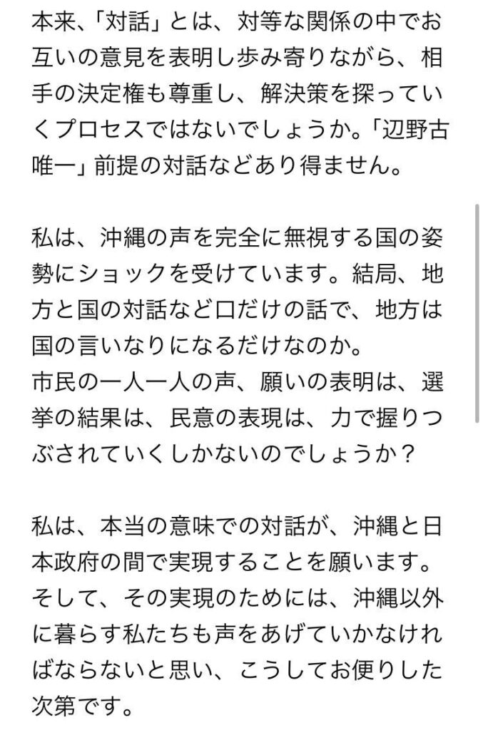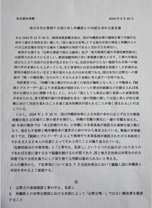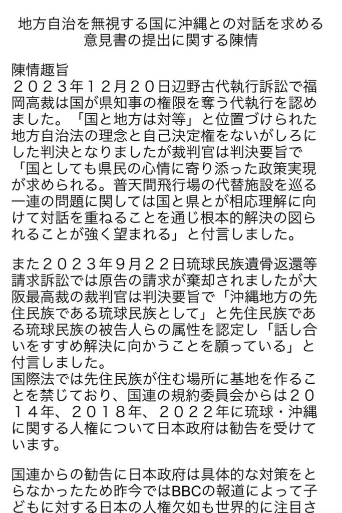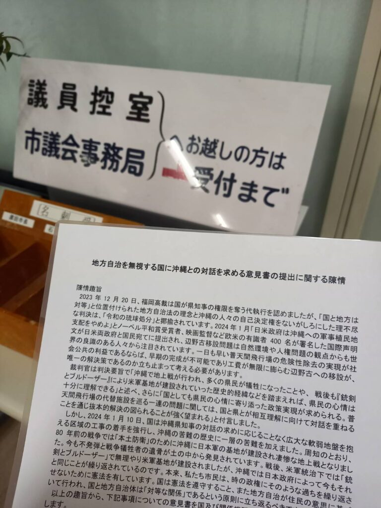 貴議会においても「外交は国の専権事項」との議論放棄思考停止に陥ることなく、地方議会としてこの異常事態を座視せず、沖縄県と政府とがもう一度胸襟を開いて真摯且つ対等の立場による対話の場を設けるよう、ぜひ国に働きかけをしてください。