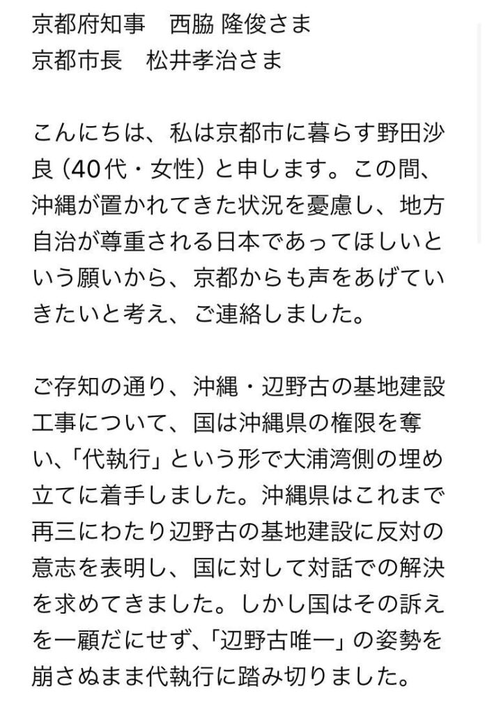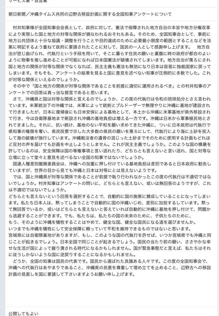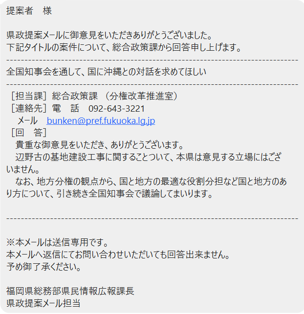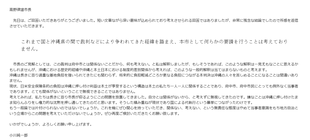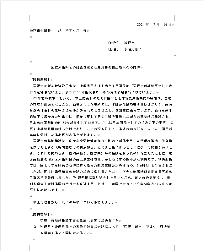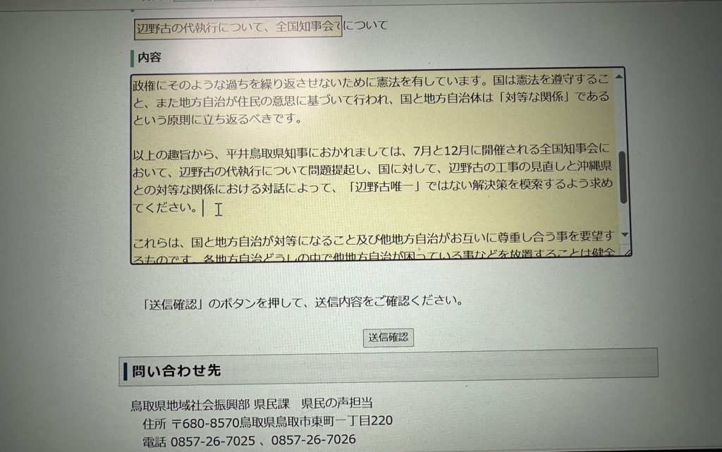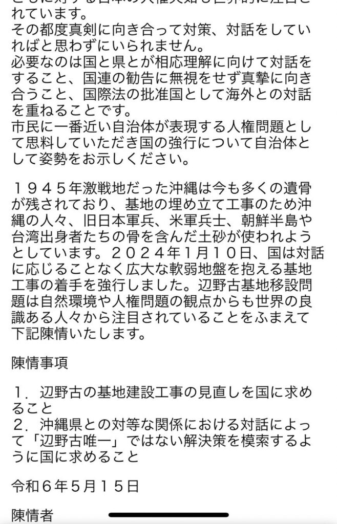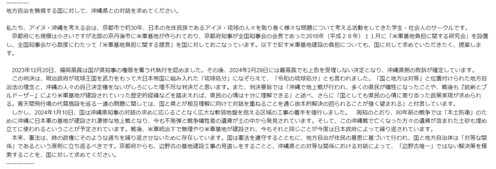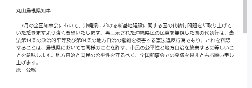 貴議会においても「外交は国の専権事項」との議論放棄思考停止に陥ることなく、地方議会としてこの異常事態を座視せず、沖縄県と政府とがもう一度胸襟を開いて真摯且つ対等の立場による対話の場を設けるよう、ぜひ国に働きかけをしてください。