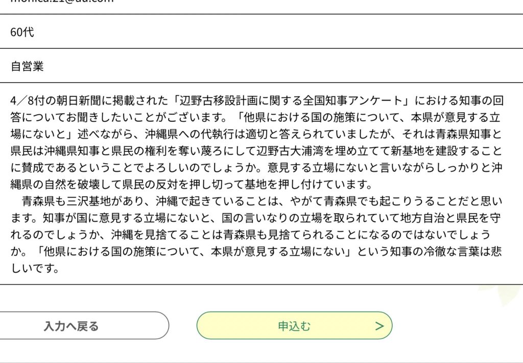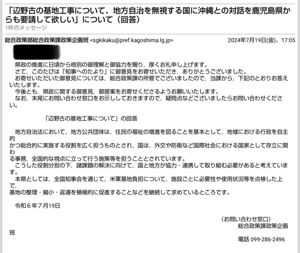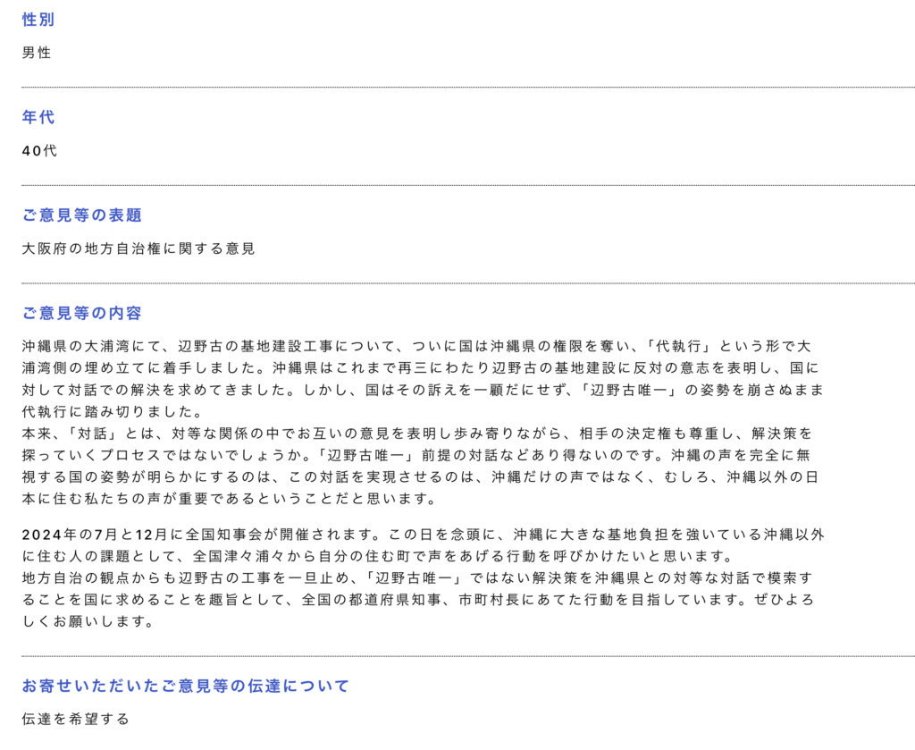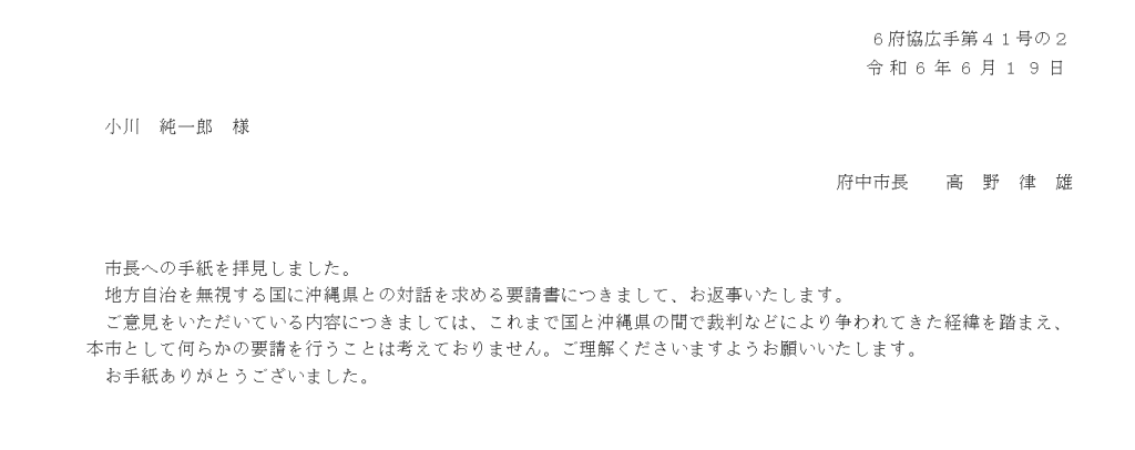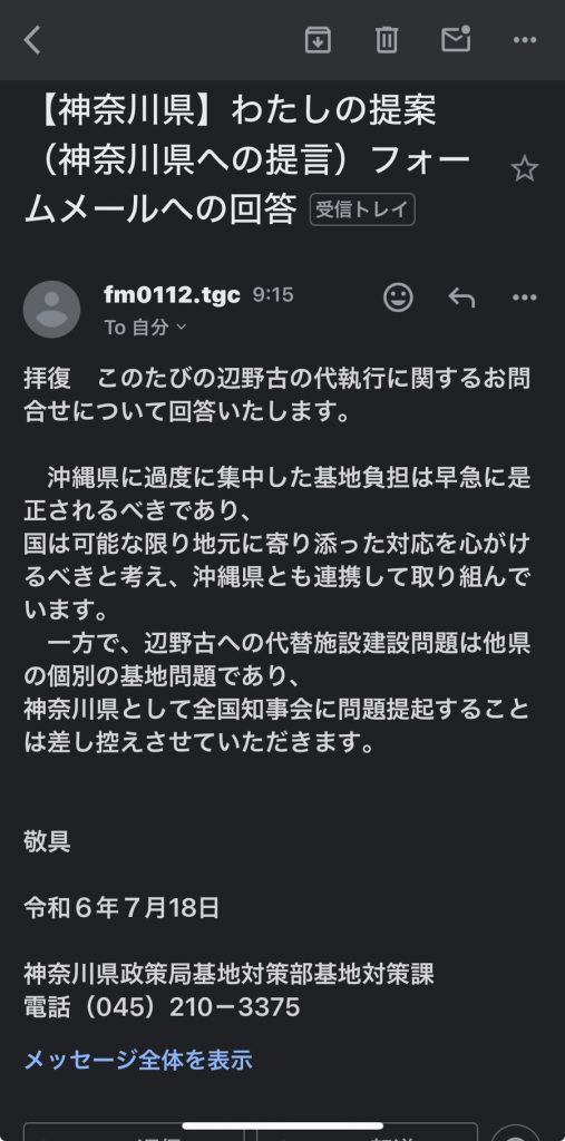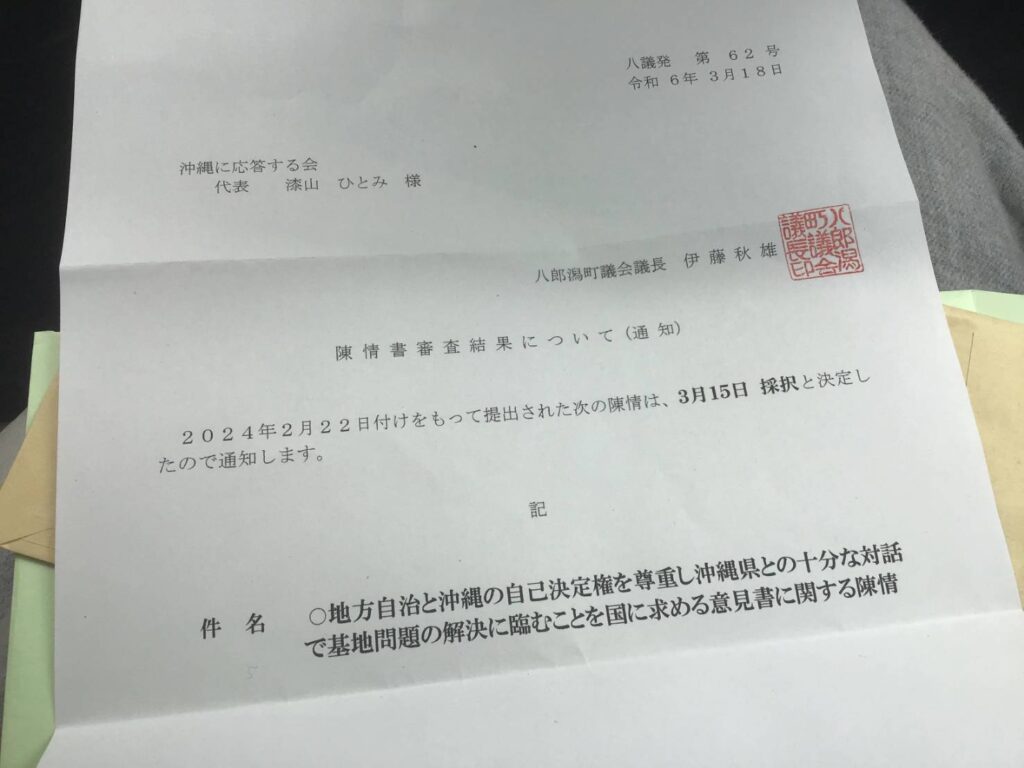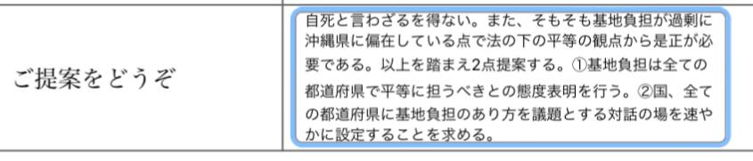 貴議会においても「外交は国の専権事項」との議論放棄思考停止に陥ることなく、地方議会としてこの異常事態を座視せず、沖縄県と政府とがもう一度胸襟を開いて真摯且つ対等の立場による対話の場を設けるよう、ぜひ国に働きかけをしてください。