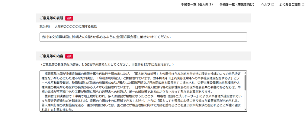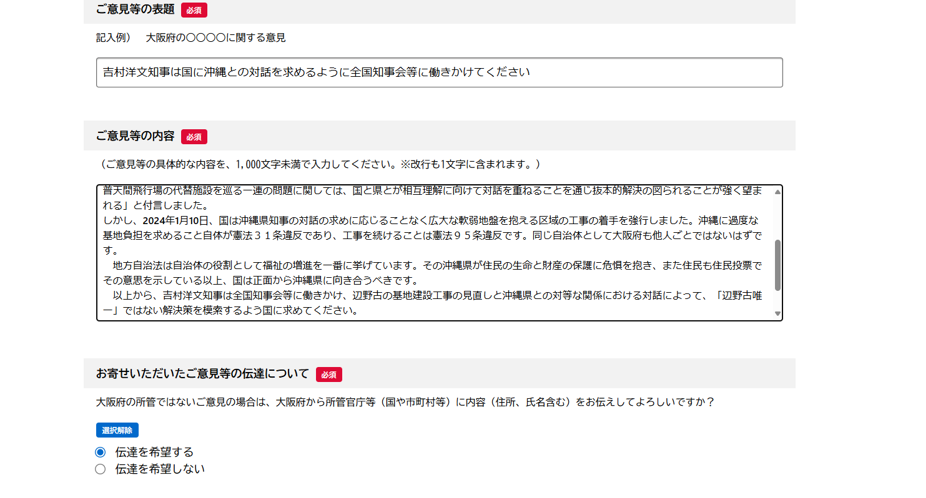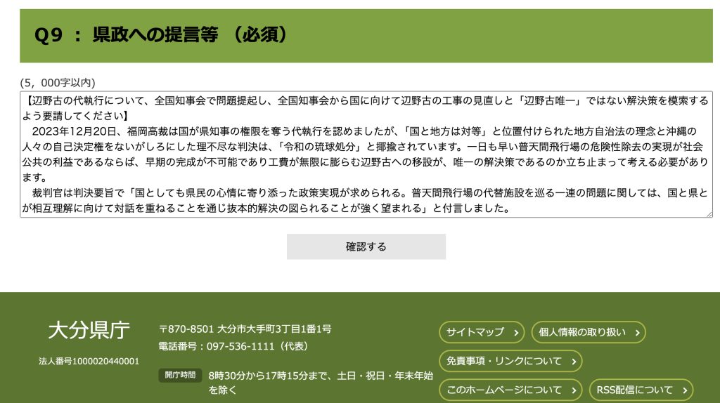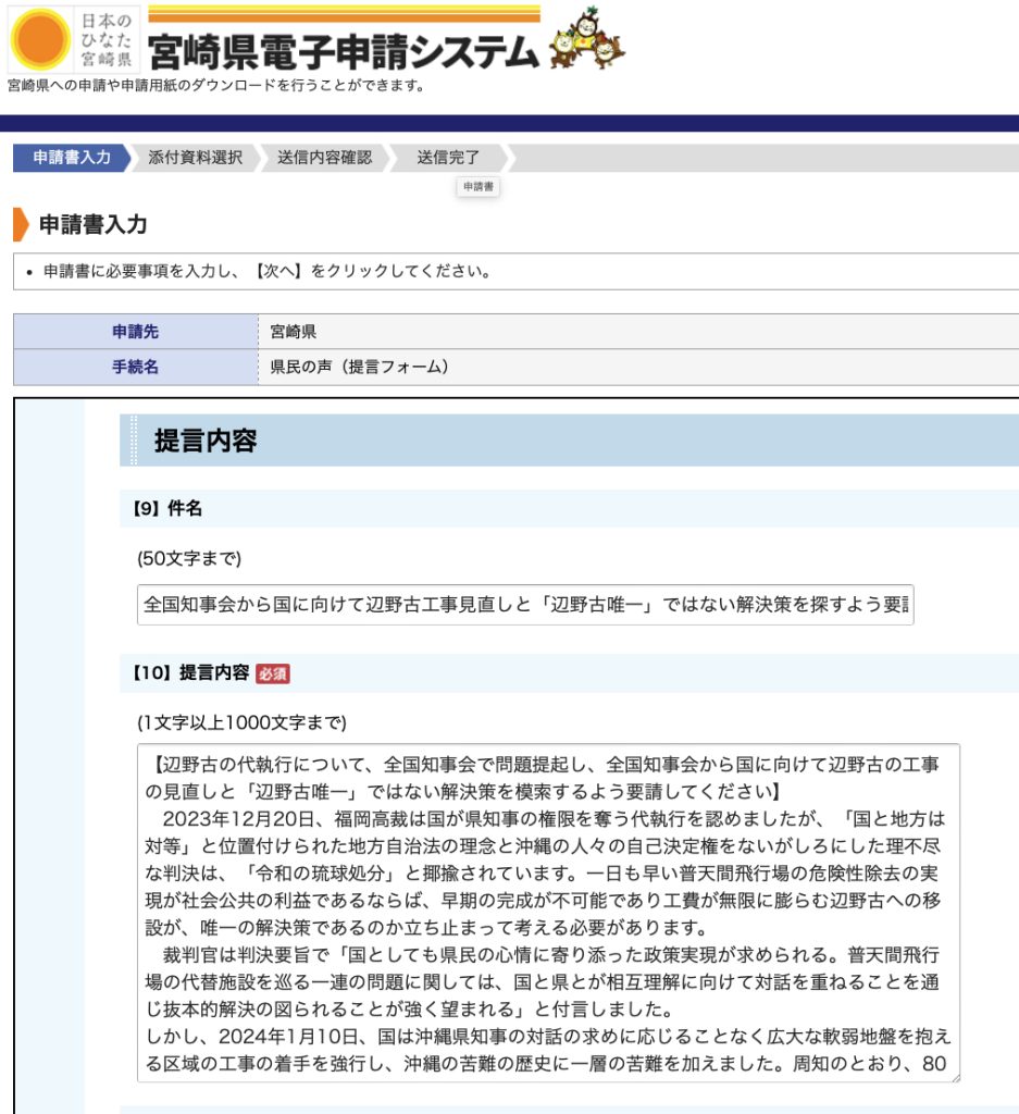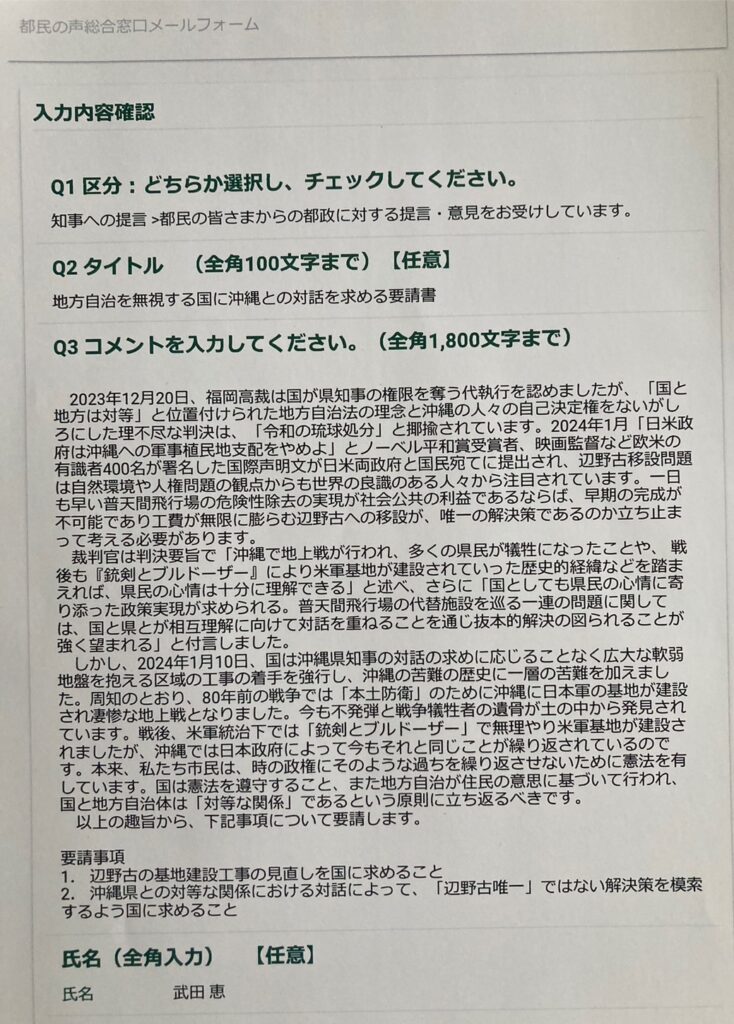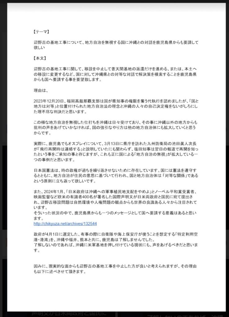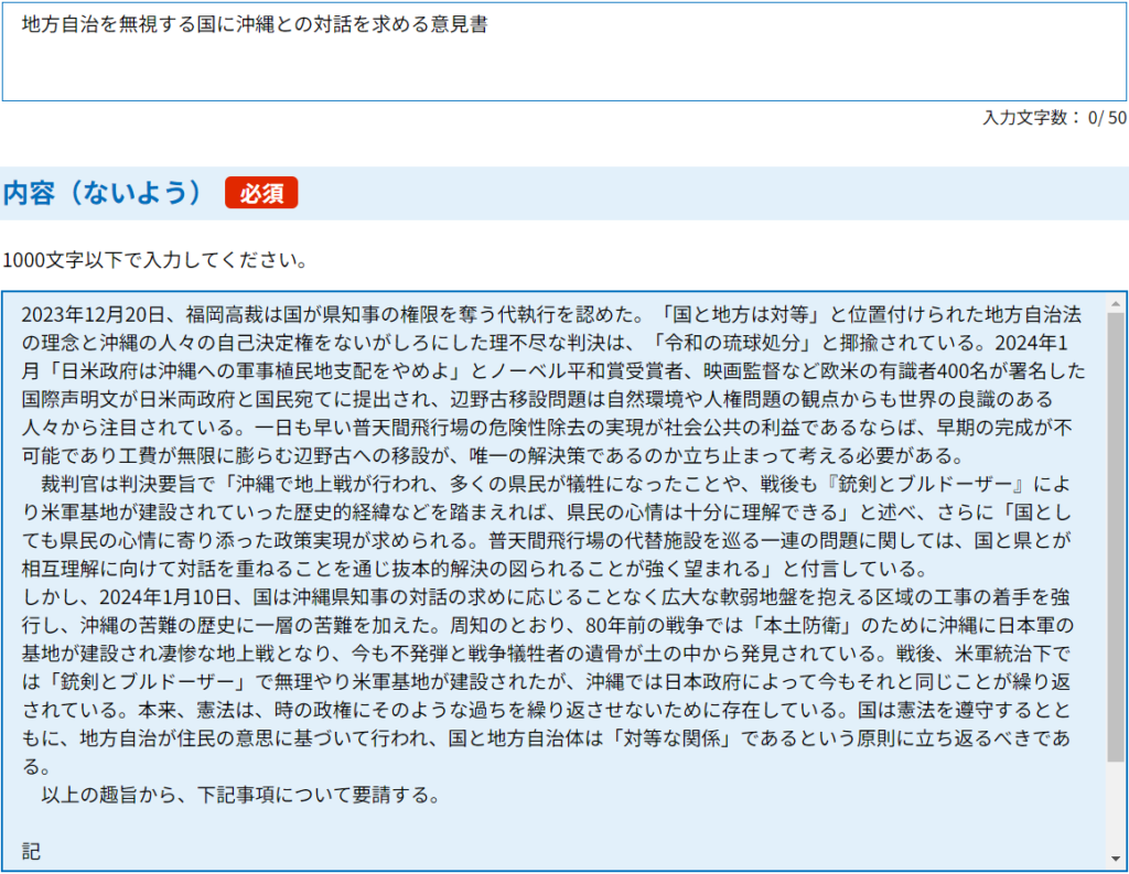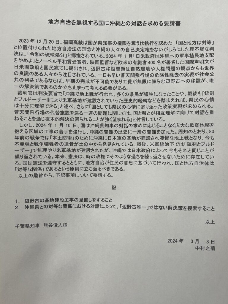 ちば電子申請サービス「わたしの提言」 (Web版)で、地方自治を無視する国に沖縄との対話を求める要請書を提出しました。(3月7日)