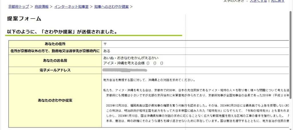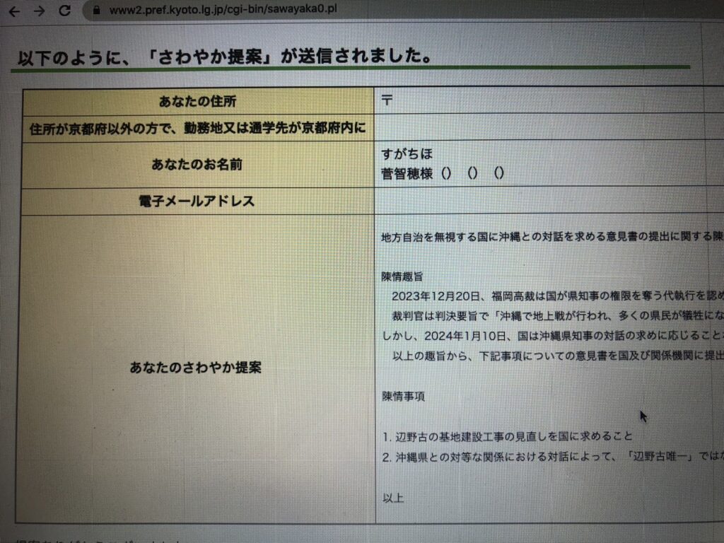 京都府知事へのさわやか提案フォームより要望しました。(3月7日)