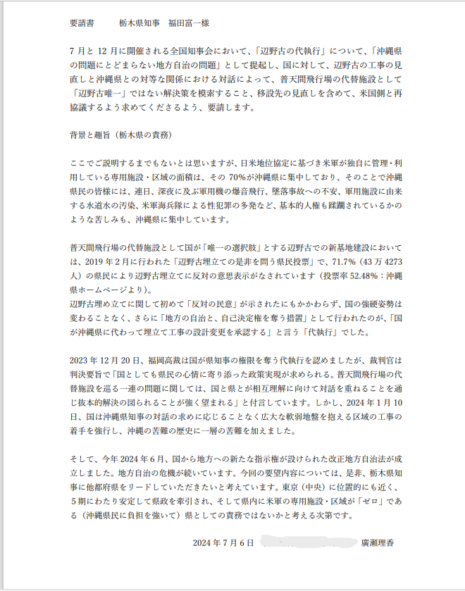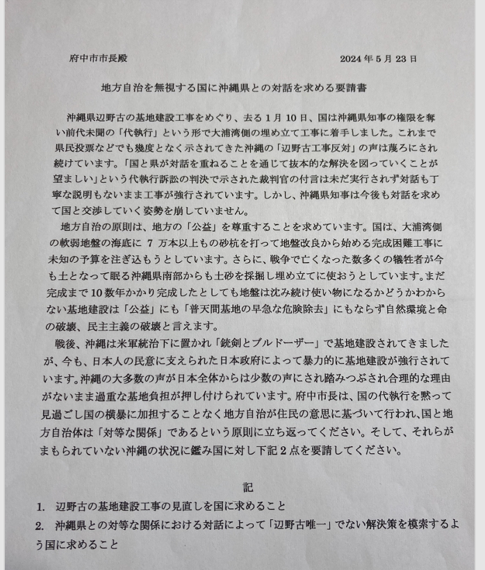 沖縄県における普天間基地移設の「唯一の解決策」として、現在国が地方自治を無視して代執行を行っている、米軍辺野古新基地建設をいったん中止し、国は沖縄県・県民の声に耳を傾け真摯で対等な対話を沖縄県と行うよう、地方議会として国に働きかけてください。