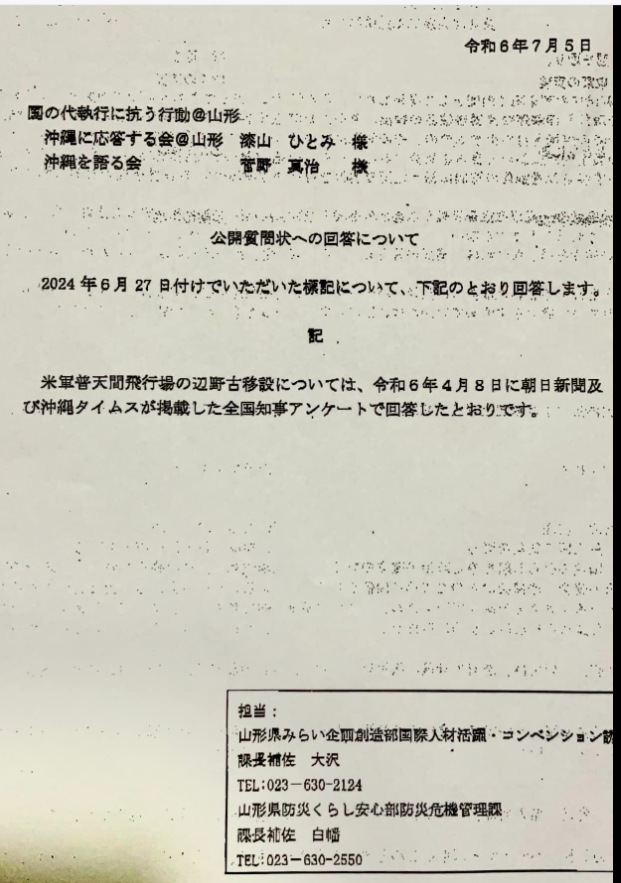 山形県知事へ提出した公開質問状への回答が届きました。(7月5日)